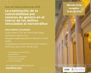 CICLO DE VIDEOCONFERENCIAS 2025 La explotación de la vulnerabilidad por razones de género en el marco de los delitos vinculados al narcotráfico Fecha: 26 de noviembre de 2025 Título: La explotación de la vulnerabilidad por razones de género en el marco de los delitos vinculados al narcotráfico Expositora: Ana María D'Alessio Ver video Material Acceso a justicia para mujeres indígenas en Argentina Fecha: 29 de octubre de 2025 Título: Acceso a justicia para mujeres indígenas en Argentina Expositora: Sandra Verónica Guagnino Ver video Material Material 2 El derecho humano al cuidado. Alcance de la Opinión Consultiva N.º 31 de la Corte Interamericana de Derechos Humanos Fecha: 24 de septiembre de 2025 Título: El derecho humano al cuidado. Alcance de la Opinión Consultiva N.º 31 de la Corte Interamericana de Derechos Humanos Expositora: Dra. Laura Pautassi Ver video Material Hacia una valoración de la prueba libre de estereotipos de género Fecha: 27 de agosto de 2025 Título: Hacia una valoración de la prueba libre de estereotipos de género Expositora: María Luisa Piqué Ver video La Protección de las Niñas, Adolescentes, Mujeres Indígenas y Campesinas Fecha: 25 de junio de 2025 Título: La Protección de las Niñas, Adolescentes, Mujeres Indígenas y Campesinas Expositor: Gonzalo Leandro García Veritá Ver video Juzgados Especializados en Violencia de Género: una mirada integral del conflicto Fecha: 28 de mayo de 2025 Título: Juzgados Especializados en Violencia de Género: una mirada integral del conflicto Expositores: Noelia Cruz y Cristian Molina. Ver video Material Estándares internacionales de los derechos de las mujeres Fecha: 26 de marzo de 2025 Título: Estándares internacionales de los derechos de las mujeres Expositora: María Sofía Sagüés Ver video Género, discapacidad y acceso a Justicia Fecha: 26 de febrero de 2025 Título: Género, discapacidad y acceso a justicia Expositora: Agustina Palacios Ver video 2024 El control de las armas de fuego como aliado en la prevención de la violencia de género Fecha: 27 de noviembre de 2024 Título: El control de las armas de fuego como aliado en la prevención de la violencia de género Expositora: María Pía Devoto Ver video Material Maternidad de mujeres privadas de la libertad Fecha: 30 de octubre de 2024 Título: Maternidad de mujeres privadas de la libertad Expositoras: Silvia Zega, Noris Pignata y Rosana Laura Fabiano Ver video Material Desenmascarando la Inteligencia Artificial: Sesgos de Género y Estereotipos en la Era de la Tecnología Fecha: 25 de septiembre de 2024 Título: Desenmascarando la Inteligencia Artificial: Sesgos de Género y Estereotipos en la Era de la Tecnología Expositora: María Sánchez Caparrós Ver video Material Análisis Forense en el Abordaje de Femicidios Fecha: 28 de agosto de 2024 Título: Análisis Forense en el Abordaje de Femicidios Expositoras: Cristina Angélica Bustos y Patricia Estela Gómez Ver video Material Panóptico del fenómeno de la cibercriminalidad. Acoso en red a mujeres, niñas, niños y adolescentes Fecha: 26 de junio de 2024 Título: Panóptico del fenómeno de la cibercriminalidad. Acoso en red a mujeres, niñas, niños y adolescentes Expositoras: Daniela Dupuy y Natalia Marcela Molina Ver video Material Acceso a la Jurisdicción de los Pueblos Indígenas Fecha: 29 de mayo de 2024 Título: Acceso a la Jurisdicción de los Pueblos Indígenas Expositoras: Martha Altabe y Elizabeth González Ver video Material La perspectiva de género a lo largo del proceso judicial Fecha: 24 de abril de 2024 Título: La perspectiva de género a lo largo del proceso judicial Expositora: Ileana Arduino Ver video Material La pericia tanatológica en casos de femicidio Fecha: 27 de marzo de 2024 Título: La pericia tanatológica en casos de femicidio Expositores: Roberto Víctor Cohen y Alejandro Félix Rullan Corna Ver video Material Otra vez Góngora Fecha: 28 de febrero de 2024 Título: Otra vez Góngora Expositor: Fernando Ramírez Ver video Material 2023 Violencia obstétrica: hacia un cambio de paradigma Fecha: 25 de octubre de 2023 Título: Violencia obstétrica: hacia un cambio de paradigma Expositora: María Victoria Jalil Manfroni Ver video Material El conflicto entre la obligación de denuncia y el secreto profesional en contexto de violencia doméstica Fecha: 27 de septiembre de 2023 Título: El conflicto entre la obligación de denuncia y el secreto profesional en contexto de violencia doméstica Expositor: Dr. Roberto Oscar Foyo Ver video Material Maternidades enjuiciadas. Problemas en la aplicación judicial de los delitos de omisión Fecha: 30 de agosto de 2023 Título: Maternidades enjuiciadas. Problemas en la aplicación judicial de los delitos de omisión Expositora: Cecilia Marcela Hopp Ver video Material Síndrome de Munchausen Fecha: 28 de junio de 2023 Título: Síndrome de Munchausen Expositora: Dra. Ivana Bloch, jueza de Cámara a cargo del Tribunal Oral Criminal y Correccional N°4 Ver video Material Material La Participación Política de la Mujer Fecha: 31 de mayo de 2023 Título: La Participación Política de la Mujer Expositor: Dr. Alberto Ricardo Dalla Vía Ver video Material Avances y desafíos en la violencia política por razones de género Fecha: 26 de abril de 2023 Título: Avances y desafíos en la violencia política por razones de género Expositora: Delfina García Hamilton Ver video Material Los estereotipos de género como condicionantes al acceso igualitario a Justicia Fecha: 29 de marzo de 2023 Título: Los estereotipos de género como condicionantes al acceso igualitario a Justicia Expositora: Dra. Marisa Fassi Ver video Material Material 2022 El costo económico de la Violencia Laboral Fecha: 26 de octubre de 2022 Título: El costo económico de la violencia laboral Expositora: Dra. Gloria M. Pasten de Ishihara y Dra. Viviana Mariel Dobarro Ver video Informes y estadísticas Responsabilidad por daños derivados por incumpl